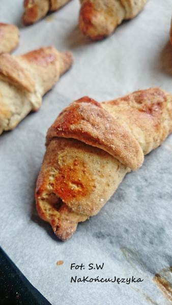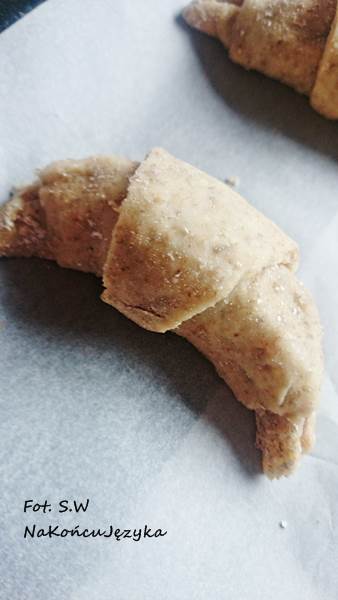 Zwijamy a następnie boki ściskamy i formujemy kształt rogala.Wierzch smarujemy białkiem
