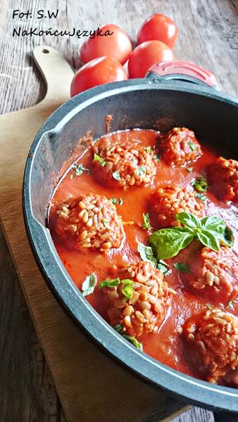 Na patelni z grubym dnem przecier pomidorowy mieszamy z przyprawami układamy klopsy i pod przykryciem dusimy około 20 min na średnim ogniu...